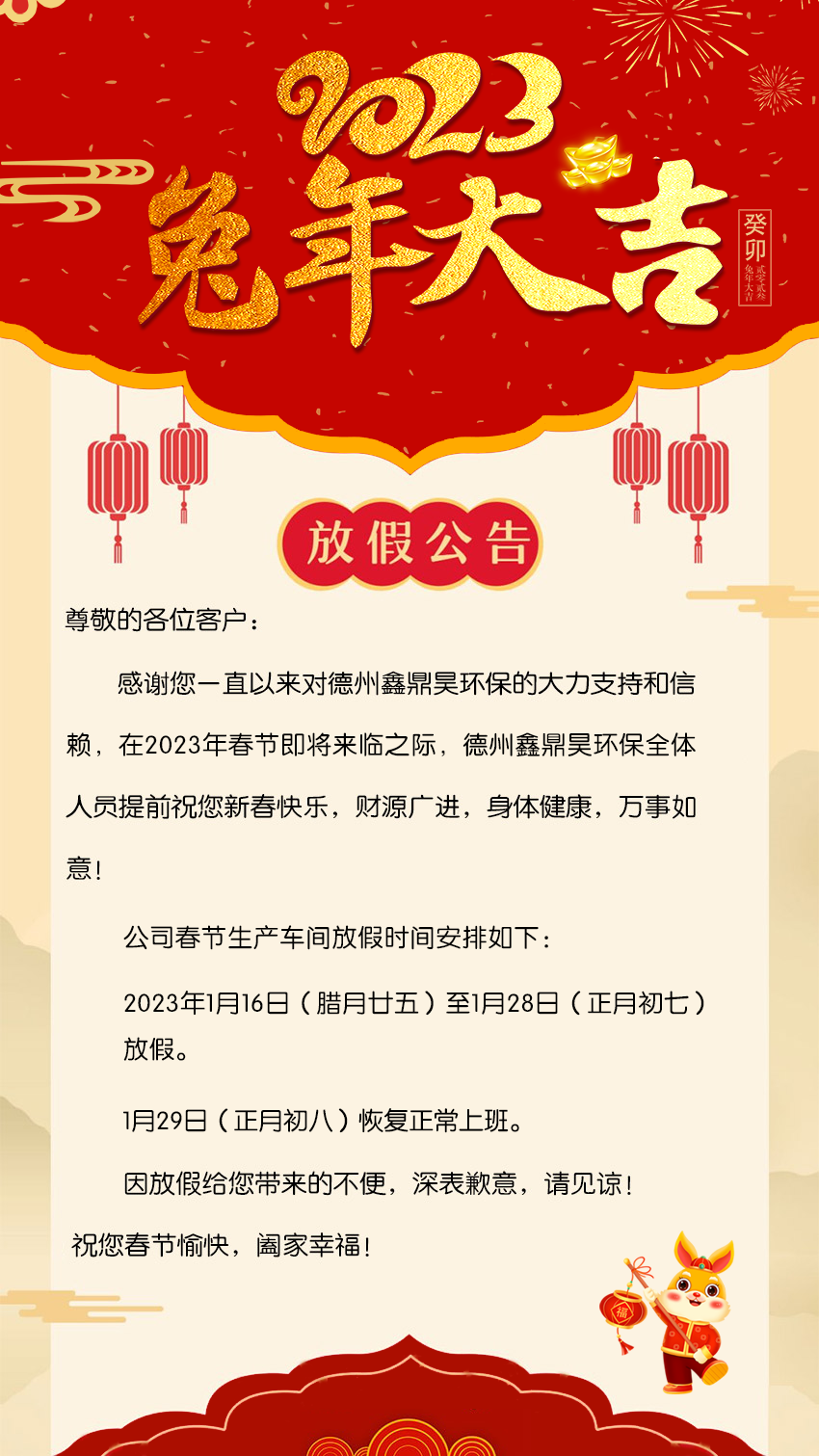 感謝您一直以來(lái)對(duì)德州鑫鼎昊環(huán)保的大力支持和信賴,在2023年春節(jié)即將來(lái)臨之際,德州鑫鼎昊環(huán)保全體人員提前祝您新春快樂,財(cái)源廣進(jìn),身體健康,萬(wàn)事如意!